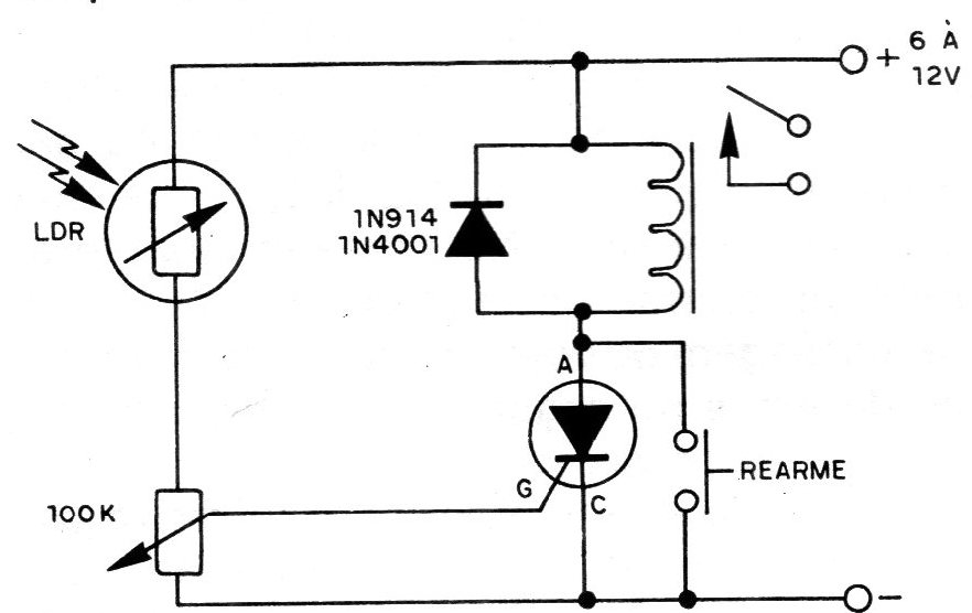 This circuit triggers a relay when a pulse of light hits the LDR. The potentiometer serves as a sensitivity adjustment, the circuit has a lock, remaining on even after the light is cut. The reset is done by pressing the pressure switch briefly. Consideration should be given to the 2 V voltage drop in the SCR while driving when choosing the relay.
