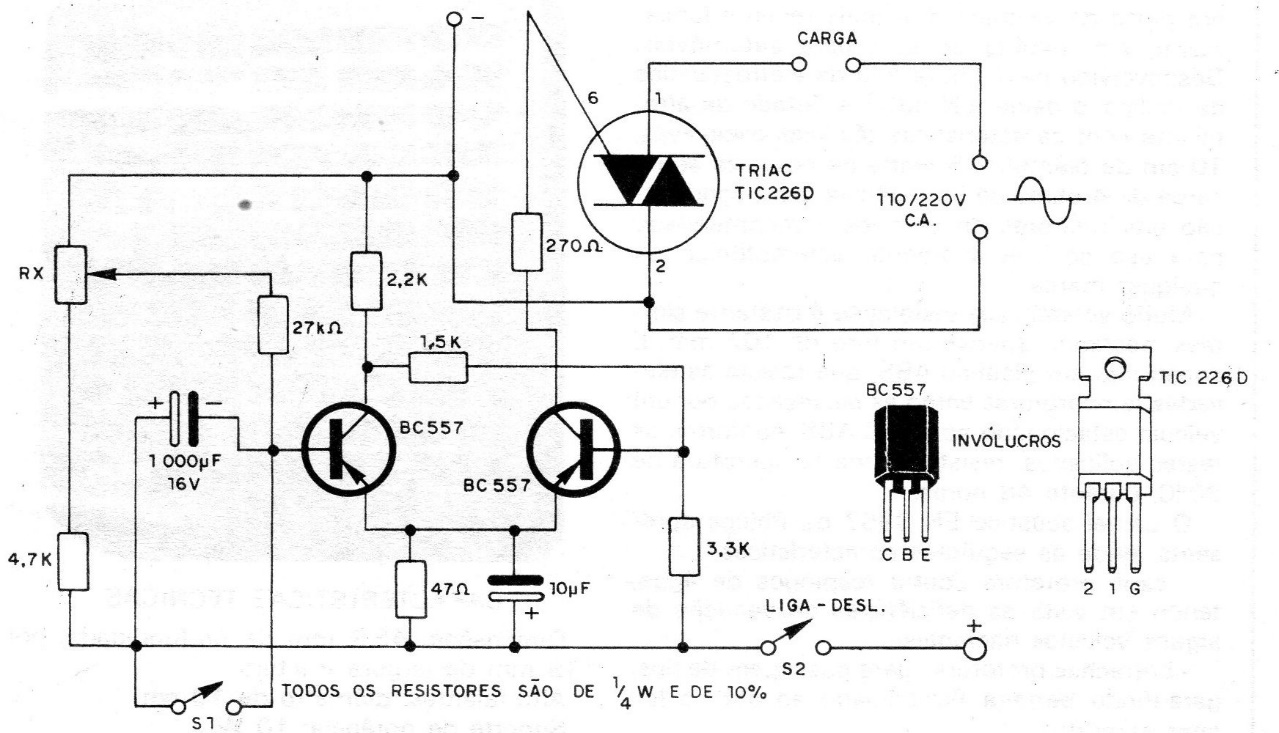 This circuit was found in a 1980 documentation. The triac used is of the TIC226D type which in the 110 V network can control loads of up to 500 W and in the 220 V network, loads of up to 1000 W. The time circuit supply must be between 15 and 13 V and the reader must use a separate source for this purpose. The timer starts operating with switch S1. When it is closed, the capacitor discharges. When opened, it will start to load until the circuit triggers with the triac shutdown. The Rx potentiometer in series with this potentiometer determines the action time of the timer. Values for this pot are between 220 k and 2.2 M.