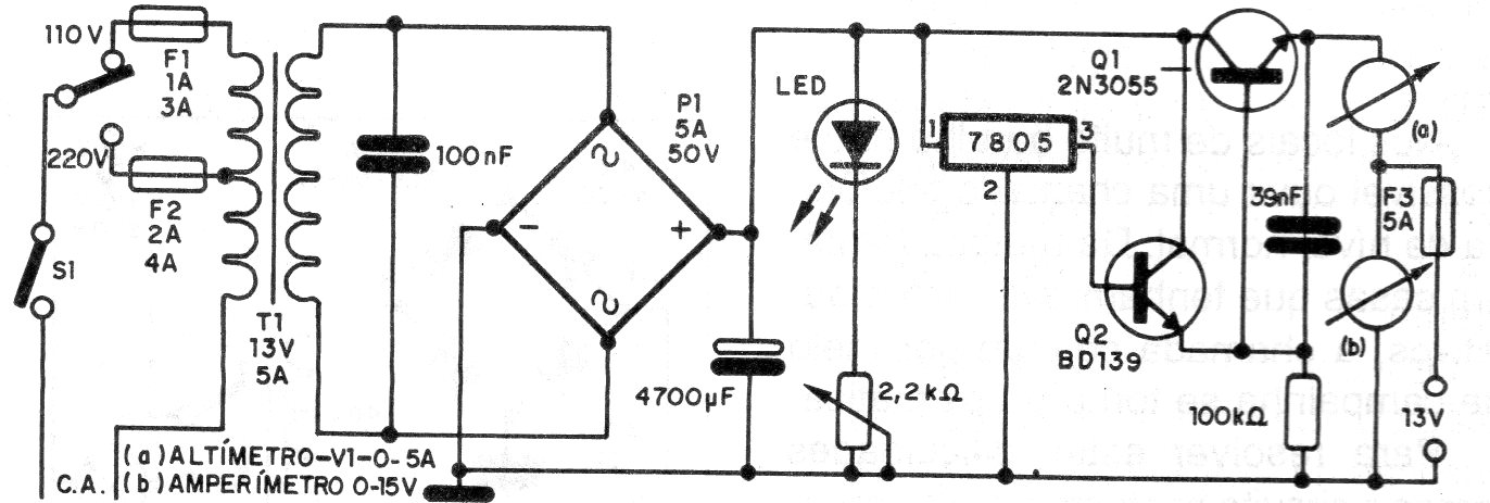 This power supply with transistor regulation was obtained in a 1995 documentation. The power transistor must have a good heat sink and the transformer must have a secondary winding of 12 or 15 V with 5 A.