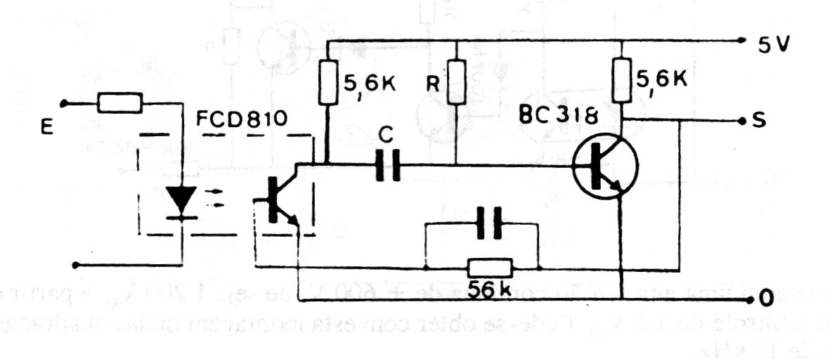 Capacitor C and resistor R in this circuit determine the time the output remains at the high level after receiving a command from the optical coupler. The resistor in series with the coupler emitter can be 330 ohms for 5 V microcontrollers and 120 ohms for 3.3 V output. The circuit is from an old French documentation. The transistor can be the BC548.