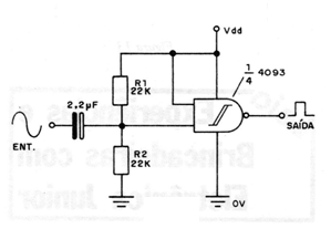 The circuit shown in the figure converts a sinusoidal signal of convenient amplitude into a CMOS compatible rectangular signal. Resistors R1 and R2, typically 22 k, determine the input impedance of the circuit, while C1 must have its value chosen depending on the frequency of the excitation sinusoidal signal. The capacitor must have a low reactance at the chosen frequency. A practical application of this circuit is as a clock for clocks synchronized from the mains. A 60 Hz sinusoidal signal can be converted into a 60 Hz rectangular signal for further division into CMOS stages.
