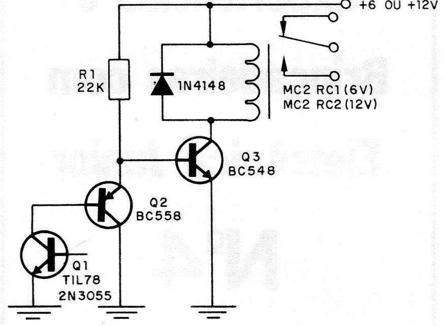 In the figure we have a circuit in which complementary transistors are used to obtain greater sensitivity in the activation by the interruption of the light. The illuminated phototransistor causes the BC558 (PNP) transistor to polarize in the sense of conducting it. The low resistance presented between the emitter and the collector of this transistor polarizes the NPN transistor to take it to cut. In these conditions, the current that circulates between the emitter and the collector of the BC548 transistor is insufficient to activate the relay. With the illumination cut, the BC558 transistor stops driving, which allows the 22k resistor to polarize the BC548 transistor in the sense of having its full conduction (saturation). The relay is then driven by a current that drives it. The sensitivity adjustment in this circuit can be added by connecting, in series with the 22k resistor, a 47k potentiometer.