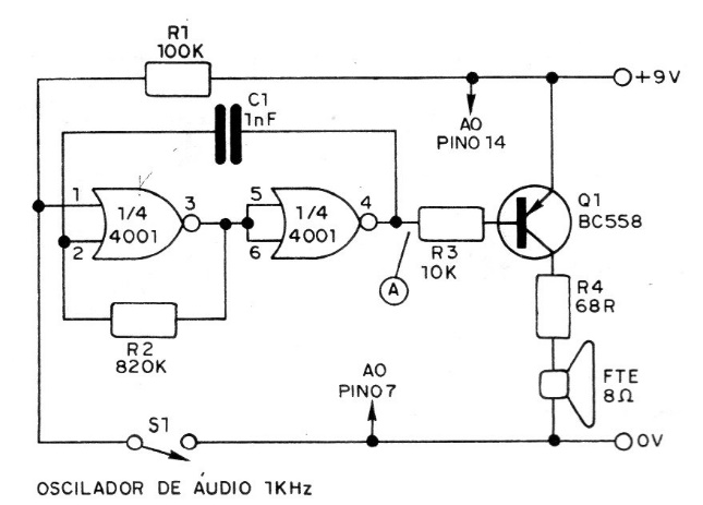 The oscillator in figure 1 can be used in alarm, call or warning systems, producing a sound of approximately 1 kHz in a common speaker. Two of the 4 NAND gates are used, in a configurable configuration whose frequency depends on C1. The transistor works as an amplifier to be able to directly excite the speaker. Even so, a resistor is needed to reduce the current intensity to a value that is supported by the general-purpose transistor. This setting is recommended for cases where low signal levels are desired. If a larger volume of sound is needed, the amplifier step of figure 2 should be used on the same circuit. This configuration in figure 2 allows a power of the order of 4W, with a voltage of 12V power supply. The 2N3055 transistor must be mounted on a small heat sink, in this version.