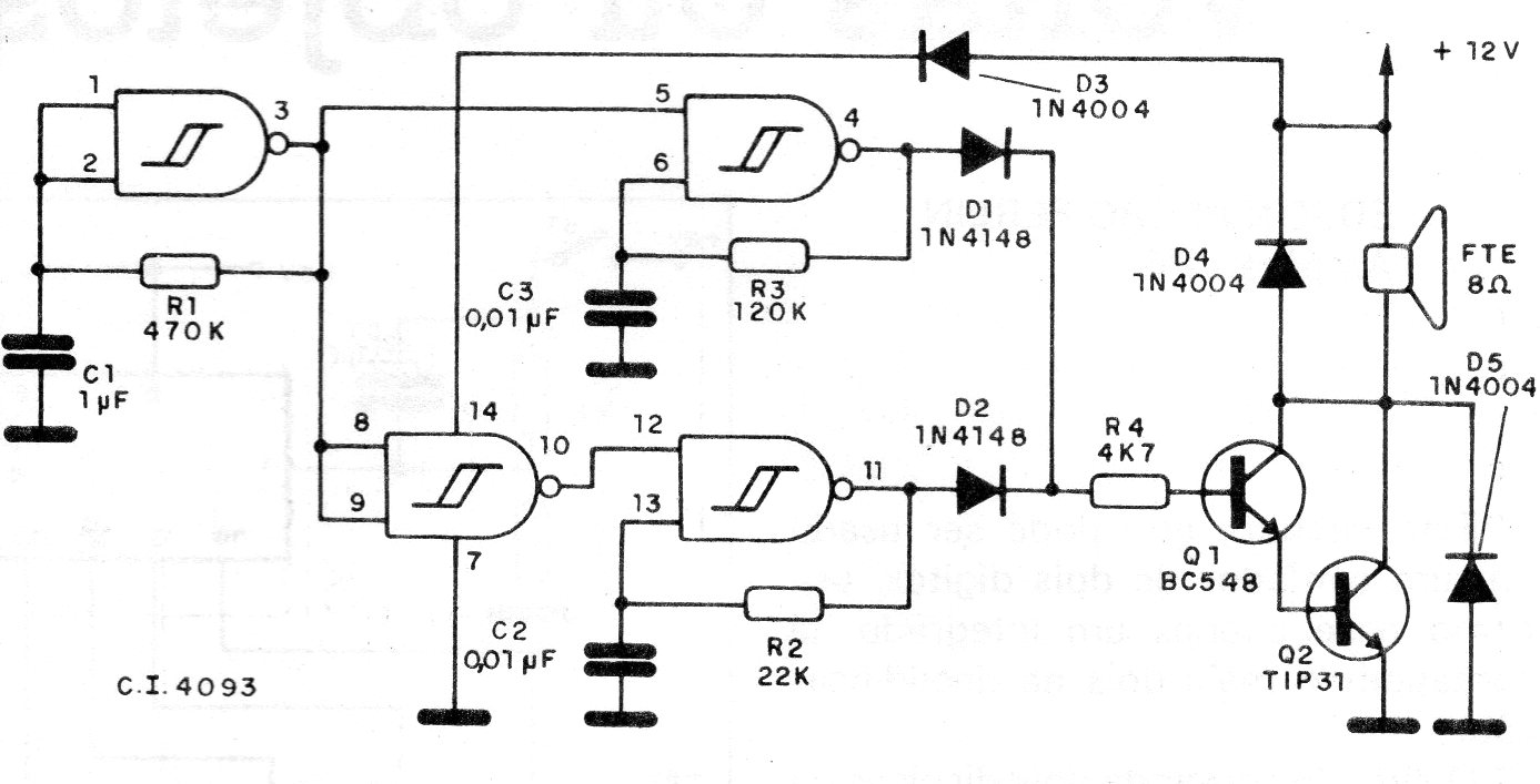 We found this circuit in a 1988 documentation, but the components used are still current. The circuit influences a power stage, where the transistor must be equipped with a good heat sink. The sound effect obtained can be modified by changing the capacitors. The supply is made with 12 V and a 2 A protection fuse must be included in series with the supply.