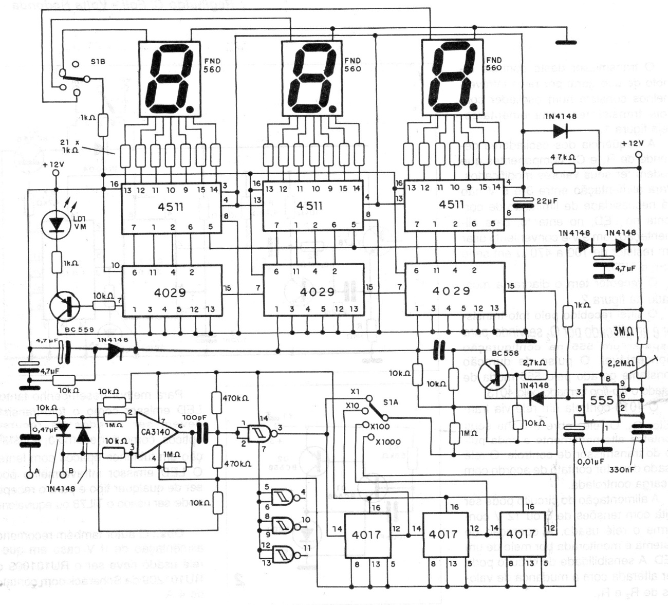 This CMOS frequency meter can measure frequencies up to about 1 MHz with a 3-digit resolution. The circuit is from 1995 documentation and is powered by a 12 V voltage. The calibration is done by a trimpot next to the time base. The circuit includes an amplifier and reaper stage that allows the measurement of signals of any waveform. The displays used are of the common 7-segment LED type cathode.