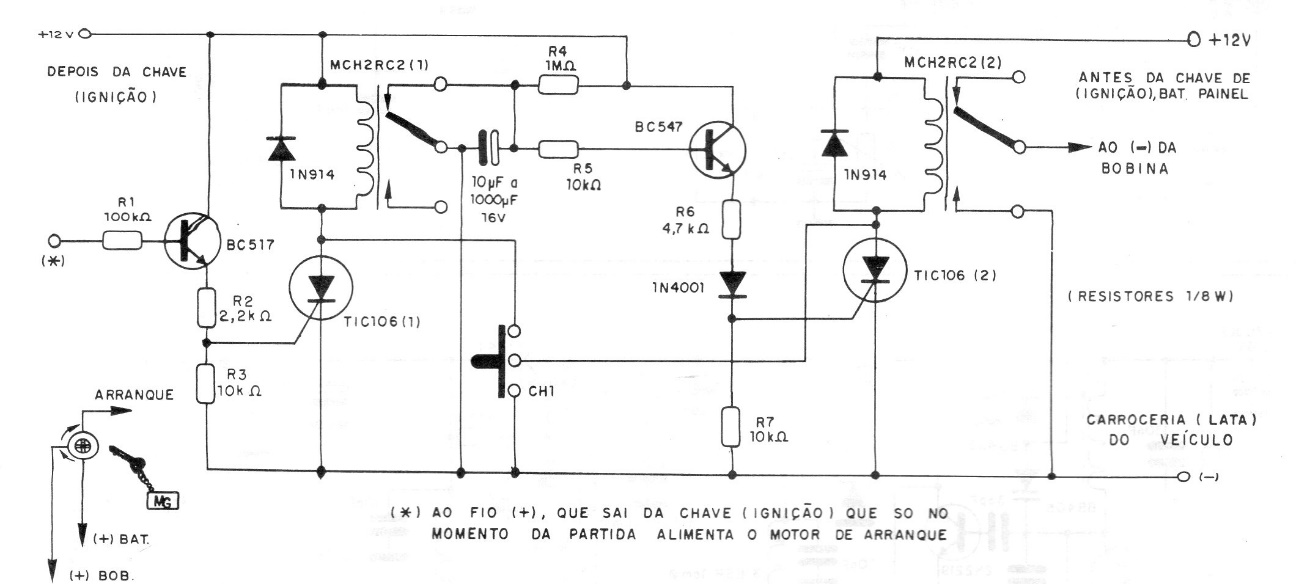 This different alarm system, found in an old publication, uses the starter chain to protect the vehicle by turning off the electrical system. Thus, to start the circuit must be deactivated by the owner before starting. The circuit uses common components and can be installed in most vehicles.