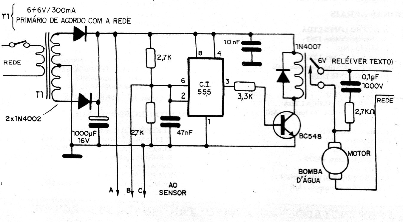 This circuit uses reed switches as sensors. We found it in a 1992 documentation. A float at a change of level has magnets attached so that they activate the reed-switches placed at different levels. The relay used must be able to withstand the pump current.