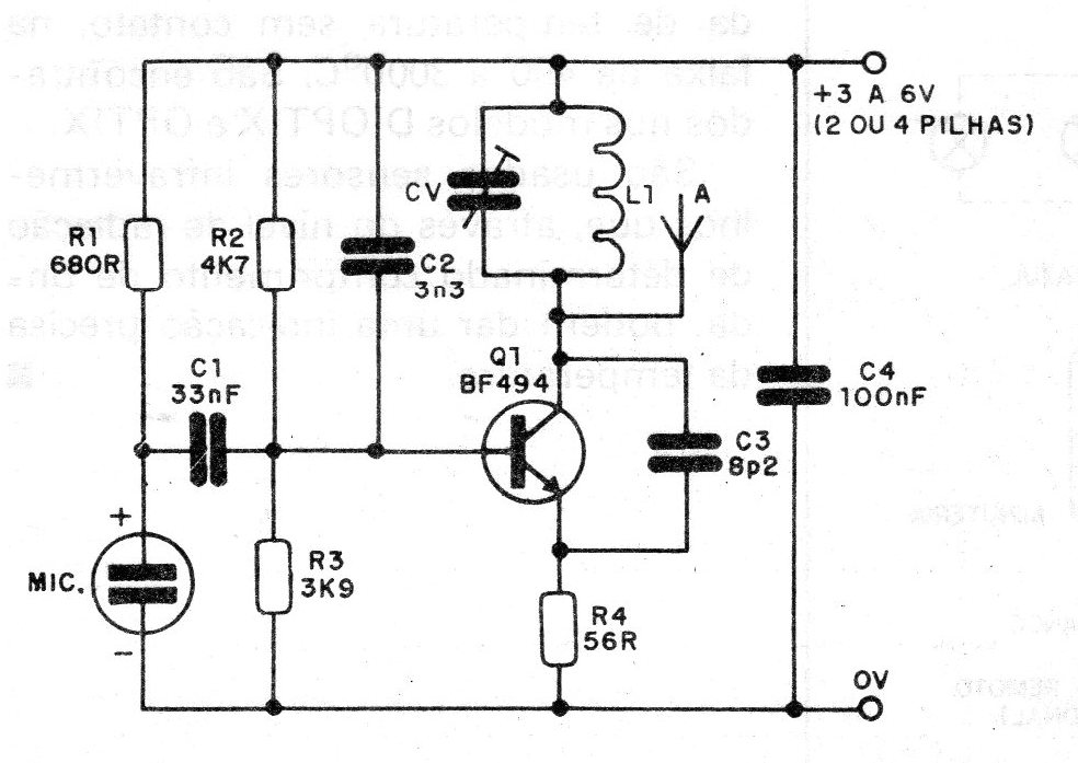 This transmitter has a range of approximately 50 meters and operates in the FM range with a two-terminal microphone. The range depends on the supply voltage, which, due to the characteristics of the transistor, is limited to 6 V. The L1 coil consists of 3 or 4 turns of enameled wire 24 or 26AWG in a 1cm form, without core, with 1mm spacing between turns. Common thread can also be used. The antenna is 20 to 25 cm long. CV is a common trimmer.
