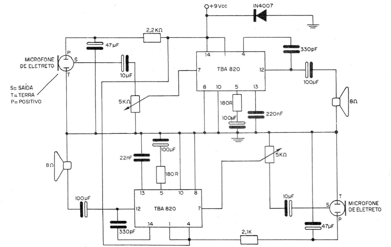 Here is a high-quality intercom for demanding readers. The circuit is from a 1982 documentation. Of course, the use of two TBA820 integrated circuits plus two electret microphones, does not make this project something that can be assembled with little expense. Its performance, however, is one of the best, considering both the quality of the used microphones and the gain and power of the integrated amplifiers. The complete intercom circuit is shown in the figure. The electret microphones used are of the type of three terminals, already quite common in our specialized market. For the best sound quality, 8-ohm speakers should have a diameter of at least 10 cm. The author of the project informs that the sound quality remains excellent with cables up to 20 meters in length, which is therefore the maximum recommended separation distance between stations. The assembly should preferably be done on a printed circuit board, in view of the gain of the amplifiers. Microphone connections must be made with a shielded cable to avoid humming. Seasonal gains will be controlled in two 5k or 4k7 potentiometers. When assembling, the reader should also note that the electret microphones have three terminals. The circuit is powered with a voltage of 9 V, which can come from either the source or batteries.
