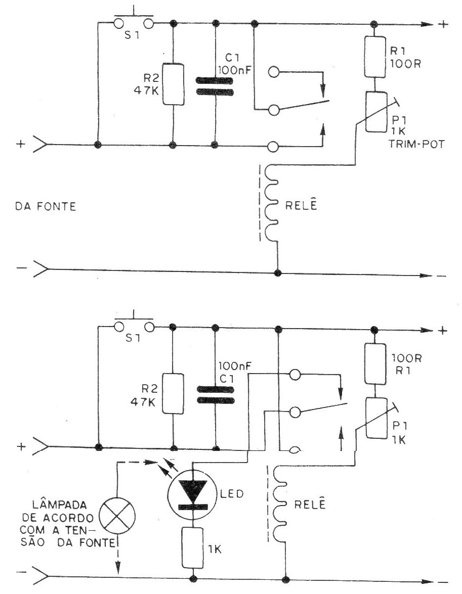 This circuit is very useful for the experimenter who may have his power supply damaged in the event of a short circuit in the device receiving his energy. What we have is a relay that is adjusted to open its contacts in case of excessive voltage drop, thus disconnecting the source. As the excessive voltage drop occurs in the event of short circuits or a load current greater than the source can supply, we have the desired protection. The relay used must have a voltage well below that of the source and operate with a small current. We suggest using a 6 V x 50 mA relay, the trimpot is then adjusted to receive this voltage only when the power supply is in normal operation. This trimpot must then be 1 k with a 100ohm resistor connected in series.