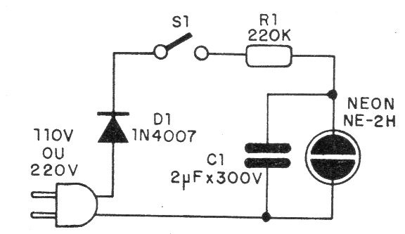 This simple circuit can be found in different versions on this website. The capacitor and resistor determine the frequency. The capacitor can be of any type with a working voltage of 100 V or more.