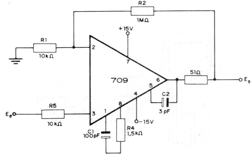 This circuit from an old documentation uses an operational amplifier that is no longer used. The configuration requires a symmetrical source, but equivalent operational amplifiers can be used. The gain is given by the relationship between R2 and R1 and can be changed by changing R2.