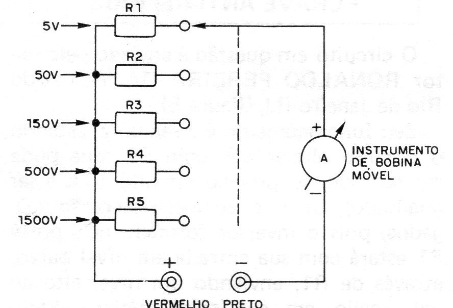 This project is especially aimed at beginners of electronics who do not yet have a test instrument on their bench. It was found in a 1982 publication. As readers can see, 5 resistors are used to determine the bottom of each voltage scale and a moving coil instrument. The mobile coil instrument can be a standard 50 uA VU or a better quality and larger instrument such as a 0-10 mA milliammeter. The selector switch allows you to choose which scale is being used, and the different colored terminals for the test leads are necessary so that the polarity in the measurement is obeyed (Figure 1). Figure 2 gives us how to change the scale of the instrument used and the table for the resistance values in the two cases of suggested instruments.