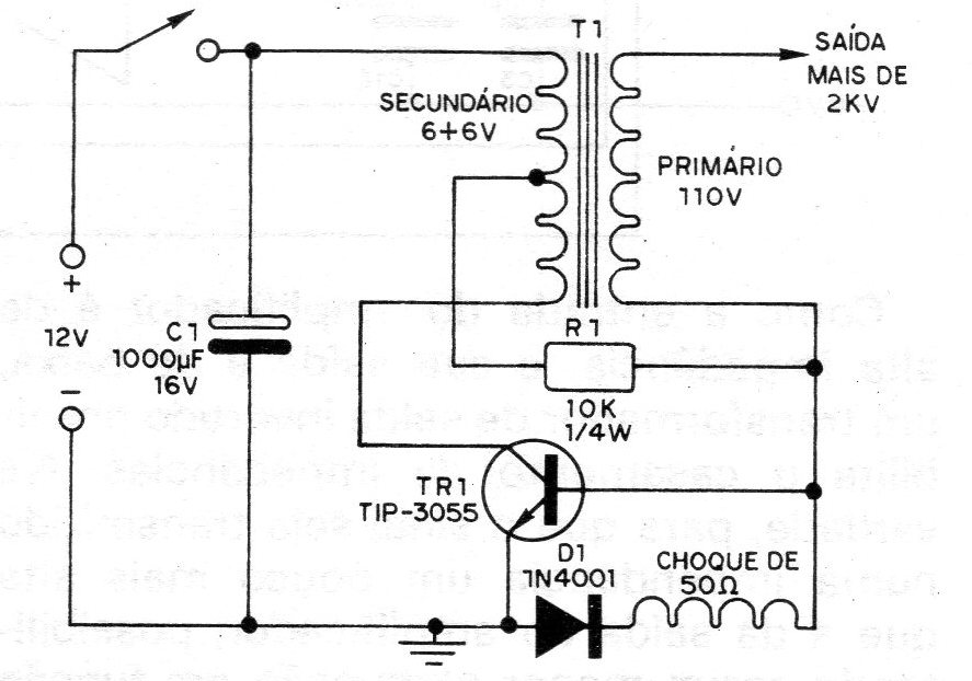 This circuit was found in a 1982 publication. From the low voltage of a 12 V battery, we can obtain a very high alternating voltage with this inverter circuit. The value of the voltage obtained depends on the type of transformer, peaks of more than 1000 V may occur in some cases. Obviously, the power transferred in this circuit is low, which means that, even with high voltage, the current is very small, and that only loads with very low energy consumption can be fed in this case. Circuits that can be powered by the inverter are therefore limited to low-power fluorescent lamps, ionizers, etc. The transformer used is of the type of supply with a secondary of 6 + 6 V and a primary of 110 V or 220 V. Of course, the primary of 220 V allows to obtain a higher voltage. The ideal operating point of the circuit is given by the value of R1, which must be achieved experimentally depending on the transformer. The TIP3055 transistor must be equipped with a heat sink.
