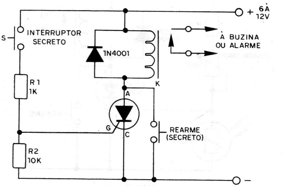 An important possibility of use for an SCR is to trigger a relay that will be connected to the horn or a siren in an automobile. The activation switch in the case will be installed on the vehicle door, and the one that activates the internal lights can be used, by switching on the panel. When the door is the same. Even after closing the door quickly, the horn will still sound. To turn the alarm off, there must be a secret switch that will turn off the circuit power. One of the advantages of this type of circuit is that its current consumption in the standby situation is practically zero, therefore, the battery will not wear out, even keeping it on all night.