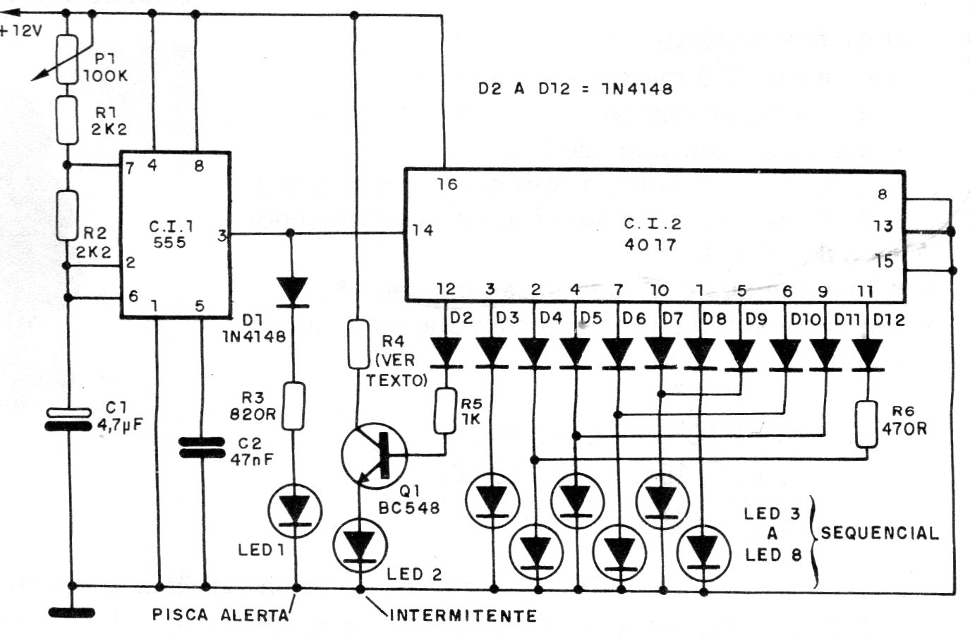 This 1988 circuit makes a back-and-forth of LEDs whose speed is controlled by P1. All components used are common and the circuit can be powered by voltages from 6 to 9 V.