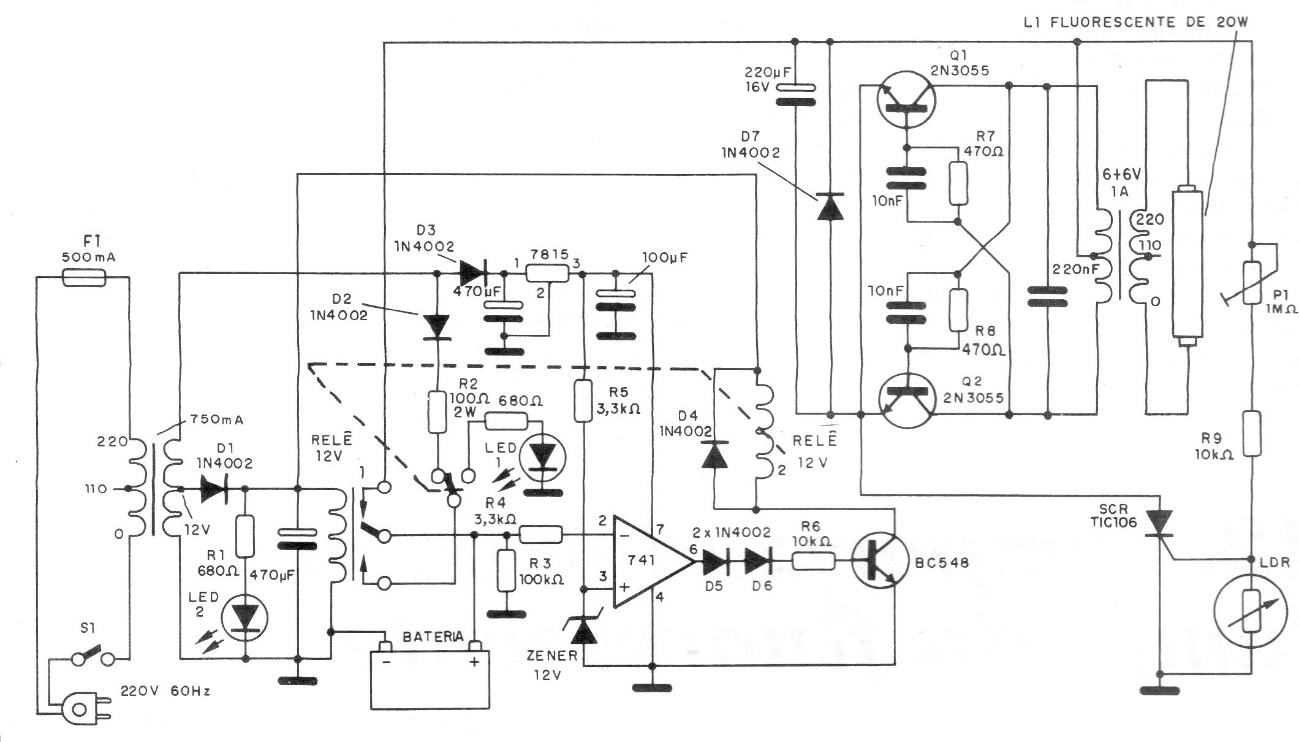 This circuit includes a battery charging system and an inverter for operating a fluorescent lamp. We found the circuit in a 1994 documentation. The inverter power transistors must be mounted on heat sinks. The battery can be of any 12 V rechargeable type and depending on the type is the value of resistor R2 that determines the charging current. The value given is for a car battery. Adjustment of the circuit trigger in the dark is done by P1.