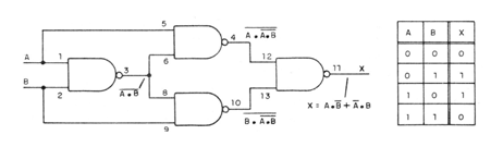 The Exclusive-OR function is characterized by the truth table of the figure itself. We see then that the exclusive condition, in which we have level 1 of output, is when either input is at level 1. For the two inputs at level 0, or the two inputs at level 1, the output will be 0. They are used the 4011 four NAND gates to achieve this function.