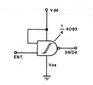 A Schmitt trigger inverter can be obtained from each gate of the 4093 with the connection shown in the figure. We thus obtain a circuit that in a slow transition from the LO to HI level provides a very fast transition from Hl to LO at its output.
