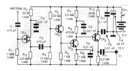 This booster for listening to signals in the range from medium waves to 30 MHz was found in a 1998 documentation. The circuit is powered by a 9 V battery or source and must be mounted in a shielded box. The circuit is of the aperiodic type, that is, without tuning.