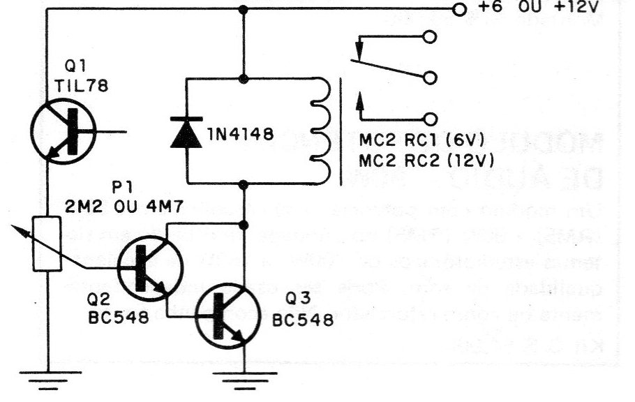 The circuit shown in the figure is a more sensitive version of the previous one (CB16105E). Two transistors form a Darlington pair, which allows to operate at much lower levels of illumination. This circuit can be used in place of the previous one if the lighting levels in which the trigger is desired are insufficient to activate that version. The components are the same, with only one more transistor appearing, which can be any general purpose, such as the BC548. The supply can also be done with voltages of 6 or 12 V, depending on the relay used.