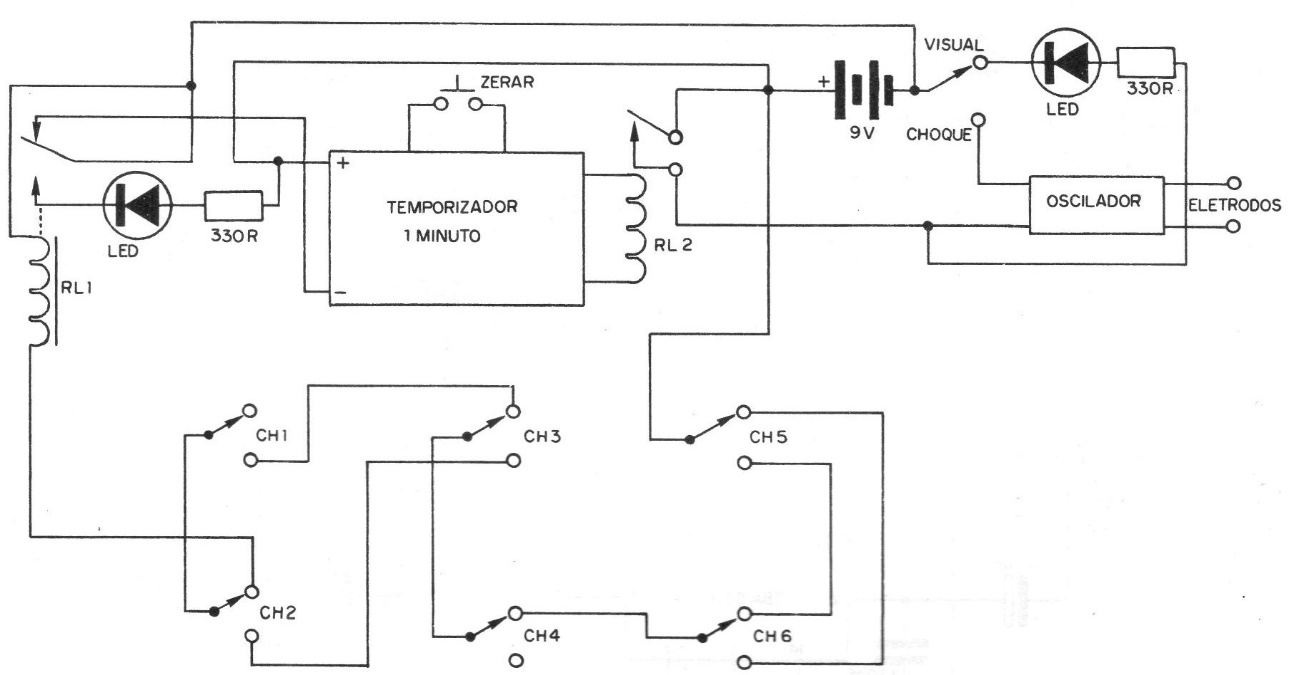 With this name we already published an interesting game. For readers who do not know, this game consists of the following: the player has to find the combination of keys that disarms the circuit timer, that is, it prevents the "bomb explosion", which will be indicated by the green LED lighting. If he cannot find this combination of disarming, we have 2 possibilities: either turn on the red LED, giving the visual indication, or else a shock oscillator (nerve exciter) is activated "punishing" the player. The timer, which can be of any type, determines the time that the player has to find the trip combination, which in this case is given by: CH5 up - CH6 down - CH4 up - CH3 up - CH1 down and CH2 upwards. The simplified circuit is given in the figure.
