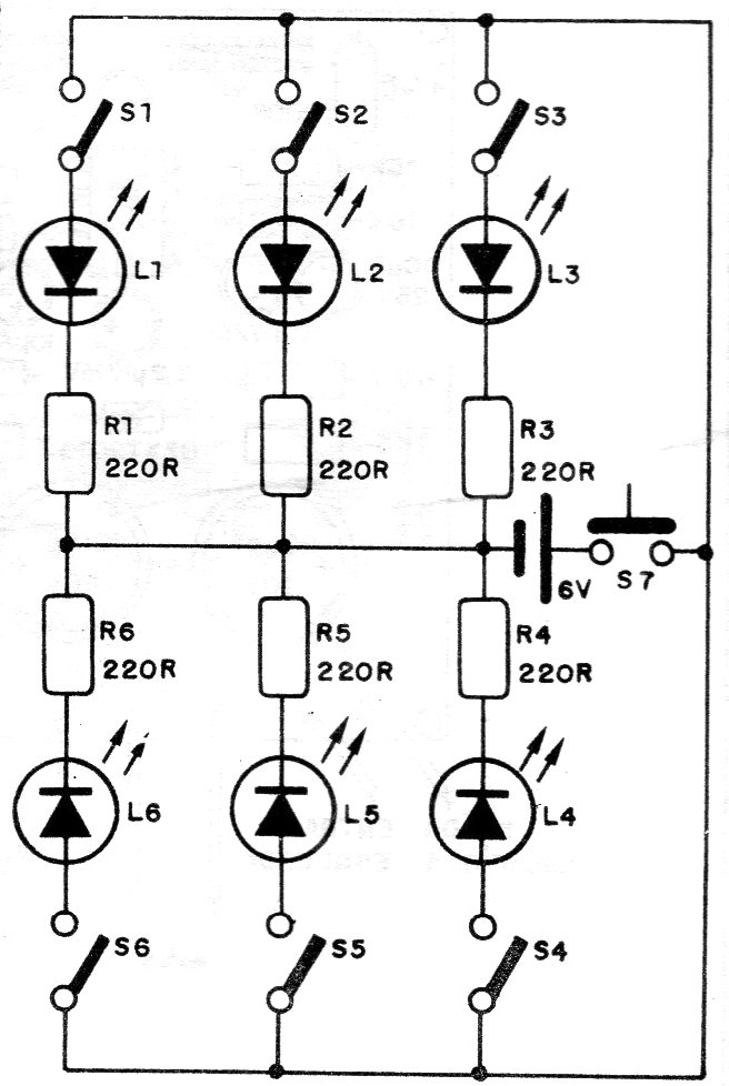 This interesting game was found in a 1987 publication, but it is very simple and can be easily assembled today. In the game, each player has 3 LEDs and 3 keys to control their LEDs. The keys are hidden so that one player cannot see another's. A number of keys are then hidden, and each player must guess how many LEDs will light. Only after data the guesses S7 is activated, turning on the LEDs. Whoever guesses the number or more approaches it wins. This is a Brazilian traditional game.