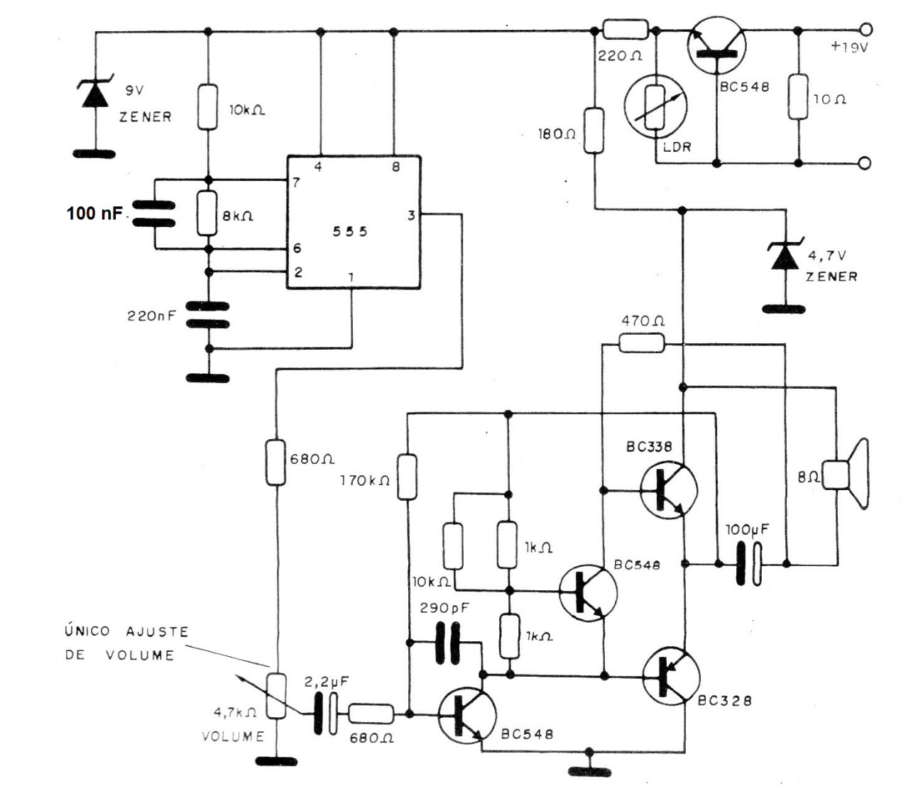 This cricket circuit obtained in a 1992 documentation has an amplifying stage that, however, takes away the realism of the project. The circuit has a volume control and a source that makes it work only when the light is cut off over the sensor.
