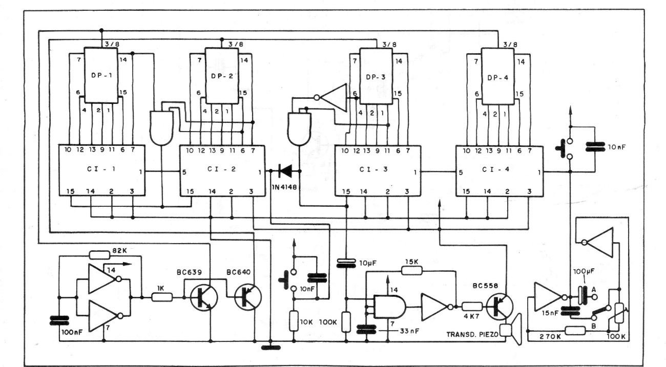 This circuit is from 1990 documentation, but it is still up to date due to the components it uses. The circuit has its own clock that must be adjusted to produce one pulse per second. The accuracy of the adjustment will depend on the accuracy of the watch. The power can be done with a 6 or 9 V power supply.