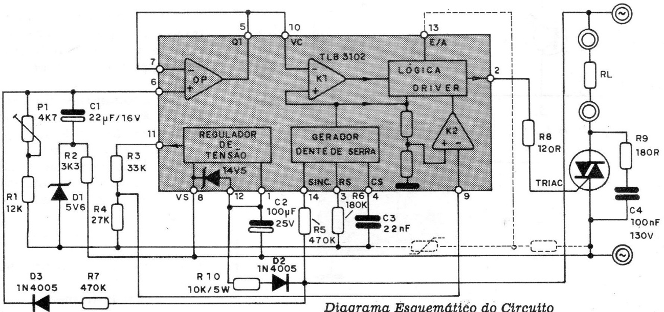 Here is a very useful circuit suggested by ICOTRON (Siemens) capable of eliminating the two-voltage switch that many devices operating on the 110 V and 220 V network have. Avoiding connection errors, which can cause the equipment to burn, this circuit automatically switches the voltage. If the 110 V device is plugged into a 220 V outlet, the voltage is automatically switched to 110 V. The base of the circuit is the integrated TLB3102 and the system can only operate on resistive circuits or universal type motors. To adjust the device, a 60 W x 220 V lamp is placed at the output as RL and the circuit is connected to 220 V. The trimmer P1 is then adjusted to have a voltage of 110 V dc RMS in the load. The voltmeter used to measure this output voltage must be of the “True RMS” scale type, as the waveform found there is not pure sinusoidal, and the common multimeters have voltage scales only for sinusoidal forms in alternating values. The circuit in dotted lines is for an option of shutdown by temperature, which can be used in appliances such as hair dryers, etc. The use of an NTC allows a maximum operating temperature to be programmed when the load is then disconnected. Trigger pulses will only be released when the device has cooled down enough to do so.