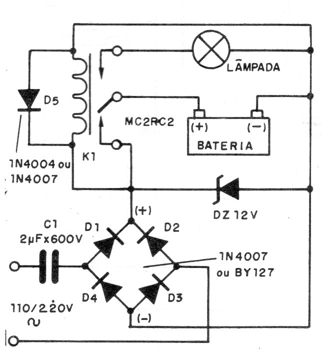 This simple emergency light circuit uses few components and a standard 12 V car or motorcycle battery. The circuit is from 1992 documentation and the relay must be 12 V with a maximum of 50 mA trip current. Instead of the lamp, LEDs or inverters for fluorescents can be supplied.
