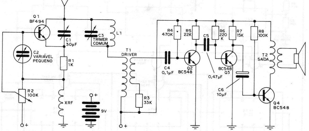 This project was found in a 1982 documentation. Super-regenerative receivers can combine great sensitivity with great simplicity. Although the selectivity and sound quality of this type of receiver cannot be considered excellent, we can say that in the case of experimental or recreational setups, these characteristics are sufficient. The receiver we give takes 4 transistors and has good sensitivity, which can be suggested as an experimental setup for capturing local FM stations. If the station is strong and close, the sound quality may be good enough to make the receiver usable effectively. Transistor Q1 is the basis of the super-regenerative detector, whose reception frequency is determined by L1 and C2, together with C3. This L1 coil consists of 3 to 4 turns of enameled wire 28 in a 1 cm diameter form.