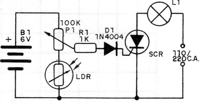 This simple circuit turns on a small lamp (or LED) when the light stops shining on the sensor for an instant. The sensitivity adjustment is made in the trimpot or potentiometer and the circuit is locked. Consider the voltage drop in the SCR if you supply the circuit with 6 V.