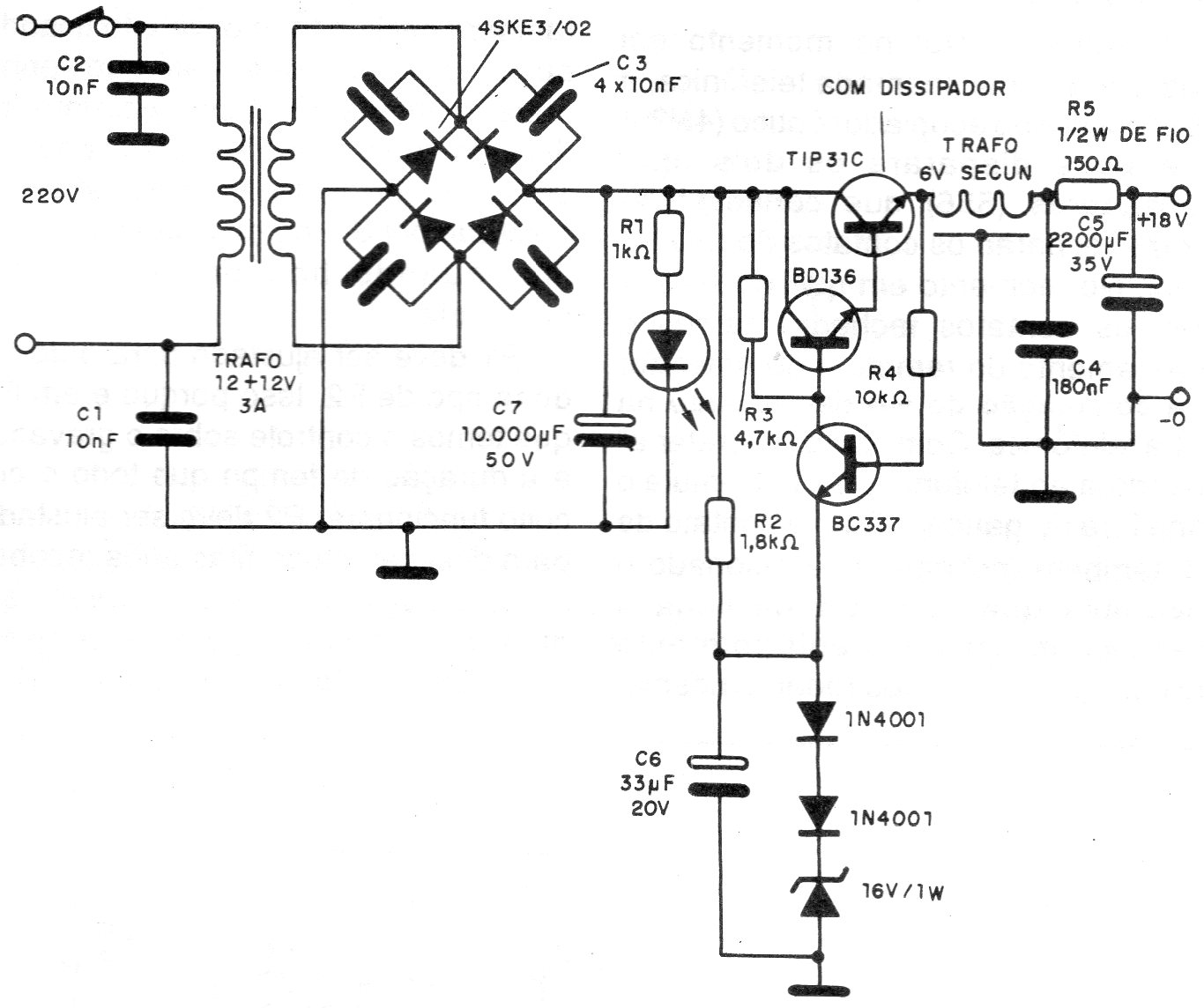 This powerful source is indicated for FM transmitters above 2 W. It provides 18.2 V of output with a maximum current of 2 A. We found this circuit in a 1992 documentation. The source has excellent filtering, which is important for the recommended application.