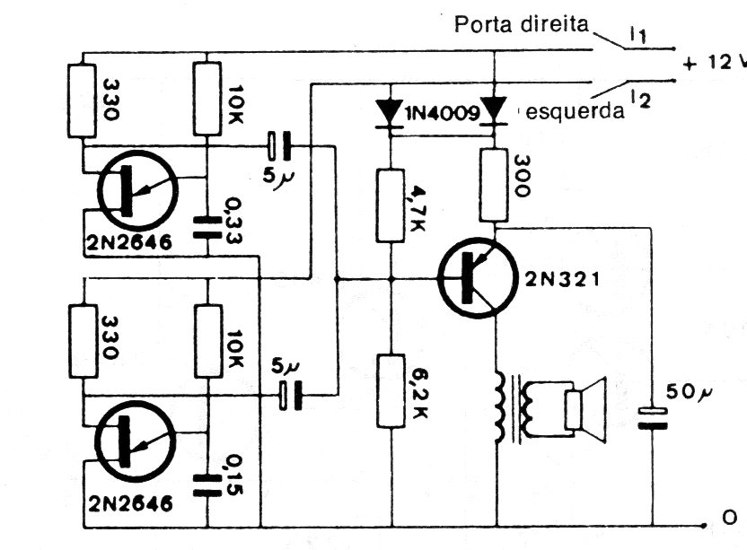 This circuit uses unijunction transistors and drives a small speaker through an output transformer. The circuit uses signals from the door switches of the protected vehicle. The transistors are 2N2646 and the bipolar can be BC548. The transformer is a 50 to 200 ohms primary impedance type.