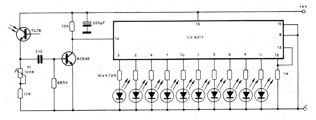 This circuit is the receiver for the CIR9984. It consists of a sequencer of 10 LEDs that is activated when the phototransistor receives a “shot” from the Laser pistol. This sensor must be placed in a tube in the center of the target. The sensitivity adjustment is done in the trimpot. The sensor must not receive ambient light directly.