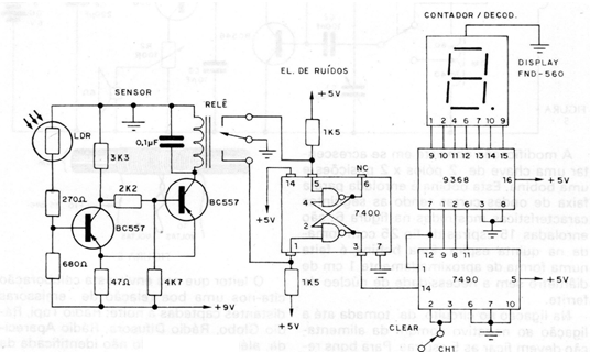 This circuit was found in a 1981 documentation. As you can see, this is a well-designed automatic scoreboard for Foosball games, in which the passage of the ball through the drawer channel after each goal changes the number of the display. Of course, for a normal application, two units like this must be mounted, installing their sensors, one at the passing of each goal. The author suggests that behind each goal there is a tube through which the ball passes when falling, and in this tube the sensor would be installed, an LDR that would be illuminated by a small lamp. The passage of the ball, interrupting the beam of light would trigger the circuit with the change of score. Of course, imaginative readers will have other alternatives for installing the scoreboard and may even be able to use it in other games or even counting objects, remembering that the use of a single display limits its capacity to values from 0 to 9.