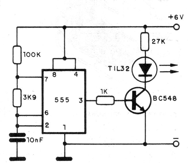 This circuit, from a 1990 documentation, can serve as a basis for a game of target-game. The receiver is given in the CB16978E. The circuit produces a modulated signal from a 555 and is powered by a 9 V battery. The emitting LED must be mounted on a tube with a lens, for greater directivity and range of the shot.