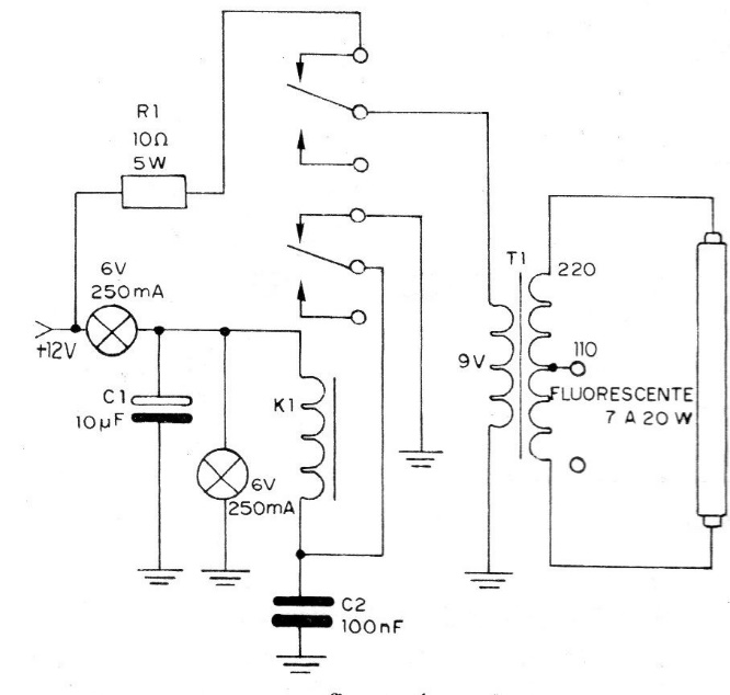 In this interesting circuit, a common relay is used as a vibrator to obtain high voltage with a transformer and thus turn on low power fluorescent lamps. Although it is not a “long-lasting” solution, as in this type of circuit the relay contacts can suffer a certain wear and this at a speed that will depend on the current, is undoubtedly an interesting alternative, which must be studied. it is “self-powered” forming an oscillator that turns the primary current of the transformer on and off. This transformer is connected to the fluorescent lamp providing the high voltage necessary to light it. The 6 V lamps used are relay voltage limiters, which are of the sensitive 6 V type, while the transformer has a primary winding of 110/220 V and a secondary winding of 9 V x 1 A. The efficiency of this circuit depends on the relay and of the transformer.