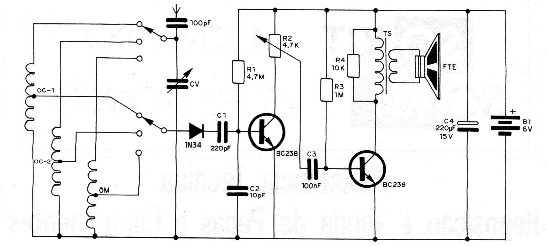 This circuit was found in a 1980 documentation. It is an interesting 3-track radio circuit whose results can be considered surprising for its simplicity. The author does not give details of the antenna used, but it must be external with at least 10 m in length for the best results, mainly in the short-wave range. The short-wave coils can be formed by 15 and 30 turns, respectively, of enameled wire 28 AWG or of approximate thickness, with socket at 59 and 109 turns. The reader who proposes to assemble the radio in question can, however, experiment with several coils. The reader mentions in his collaboration that this radio actually consists of an adaptation of the one published by us on this site.