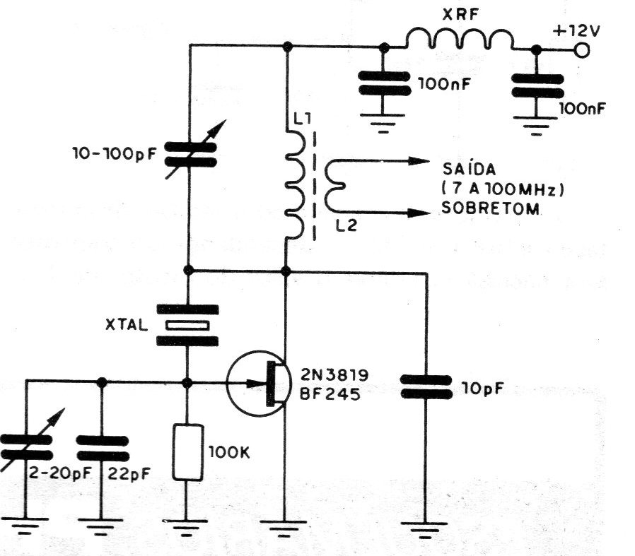 This version of oscillator with crystal using a junction FET operates in frequencies in the range of 7 to 100 MHz. The FET can be 2N3819 or BF245 and the supply will be between 6 and 18 V. The tank circuit, formed by L1 and L2 , has the same characteristics as used in the CI8796 circuit). The XRF reactor must have an impedance high enough at the operating frequency to prevent the signal from passing to the source. The capacitors are all ceramic in view of their characteristics. The tank circuit, formed by L1 and L2, must be adjusted to have the resonance frequency equal to the operation of the crystal, when the generated signal will be present at the output with maximum intensity. By adjusting the tank circuit to multiple frequencies than that produced by the crystal, it will still oscillate, and we may behave differently for the oscillator. With a 27 MHz crystal we can generate signals of 54 or even 108 MHz. The current consumed by this circuit will be less than 10 mA with a supply voltage of 12 V. The 10 pF capacitor can be omitted in some types of transistors. field effect.
