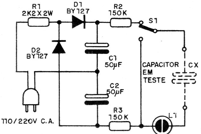 In the 110 V network, capacitors of 200 V or more and in the 220 V network, capacitors of 400 V or more, can be tested in this simple circuit. The indication is given by a neon lamp.