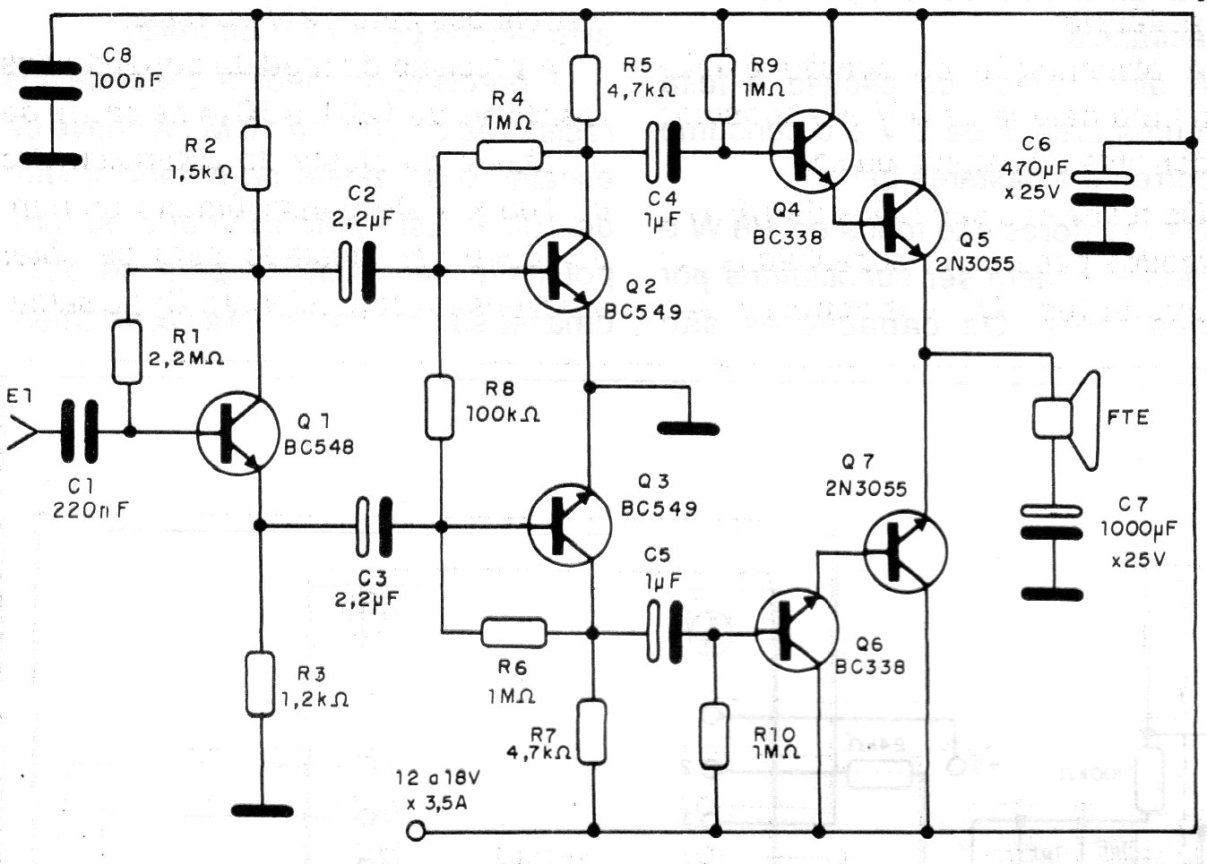 This amplifier uses common transistors in a phase inverter configuration. Transistors must be equipped with good heat sinks and special care must be taken with high current tracks. The symmetrical 12 to 18 V supply with 3 A is given in CB16744E.