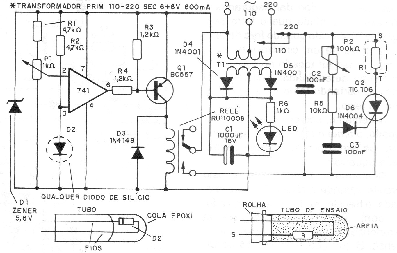 The automatic heating system sensor is a diode placed in a waterproof tube as shown in the figure. The circuit has the trigger point set at P1 acting on a relay that controls the heating element. The heating speed is set in P2. For the low voltage sector, the circuit already has its own source. The heating element can be commercial or made with 470 ohms to 1.2k wire resistor with 10 W dissipation.