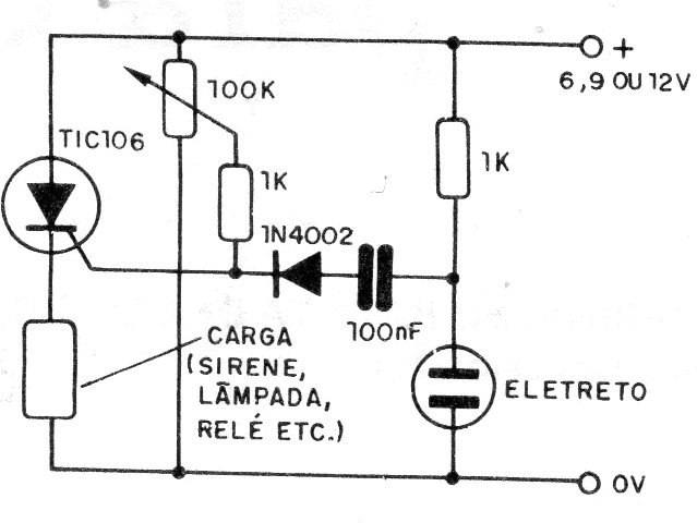 The sensor of this circuit, from an old documentation, is nothing more than an electret microphone. The circuit triggers an SCR and must be powered by a continuous voltage of 6 to 12 V and considering the 2 V drop in the SCR. The potentiometer sets the trigger point.