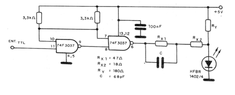This TTL circuit from a 1992 documentation supports speeds up to 170M baud and must be powered by a voltage of 5 V. The emitting LED must be of an appropriate type for the fiber used. In the diagram, the other characteristics of the circuit.
