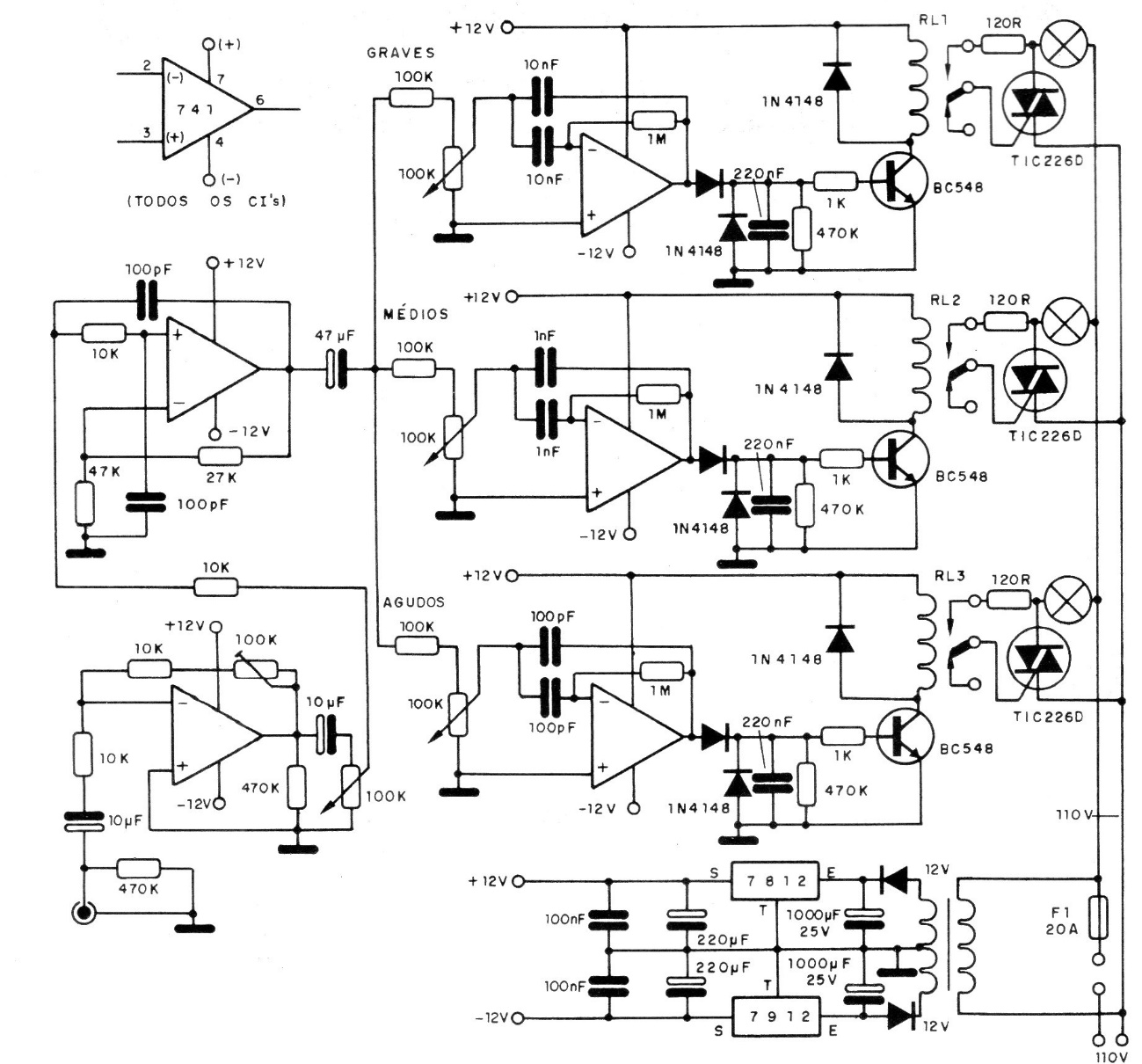 This sophisticated circuit with a low, medium, and high treble filter is from 1990 documentation. The circuit must only be used with incandescent lamps and the triacs must be equipped with good heat sinks. The circuit uses a symmetrical source for the operational amplifiers. The potentiometers adjust the operating point. The downside of this project is the use of relays to control triacs.