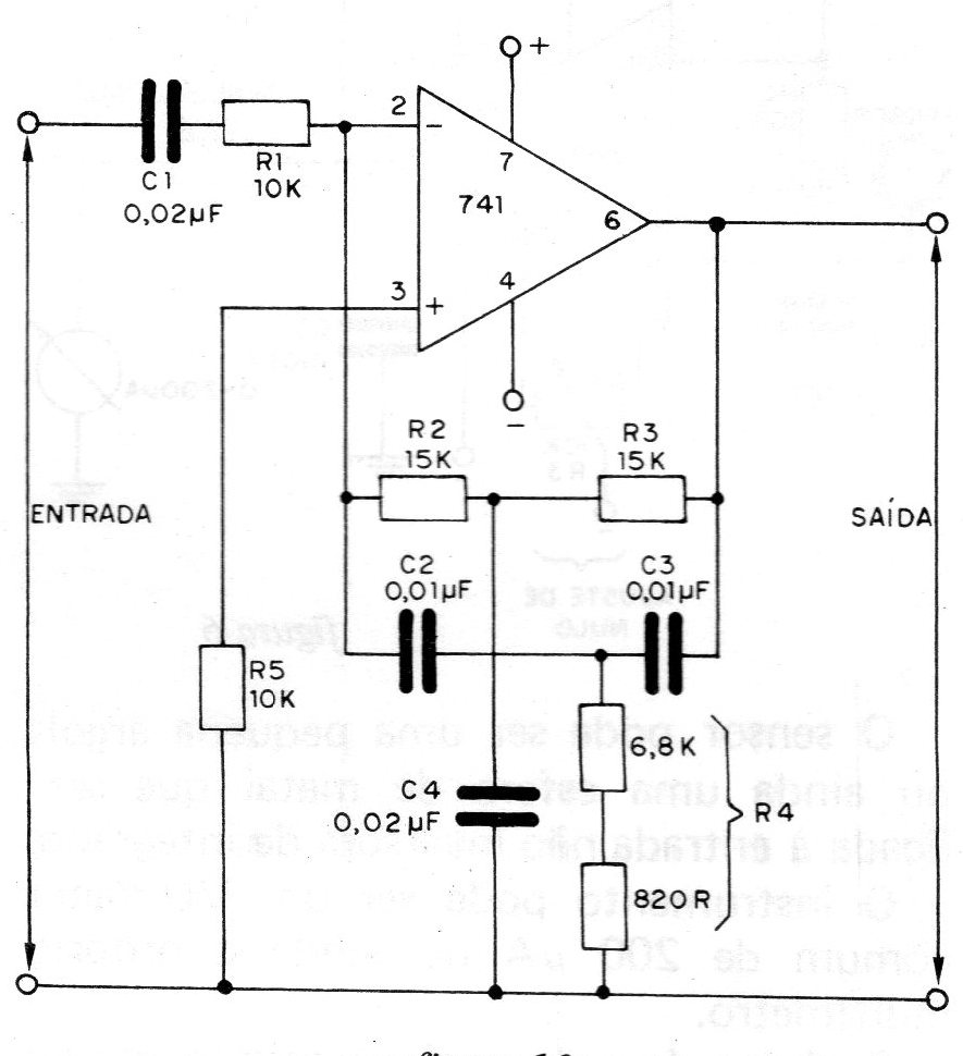 The filter shown in the figure, using only an operational amplifier, is characterized by allowing 1 kHz signals to pass freely, which are amplified 200 times, with signals from other frequencies being rejected. The quality factor of this circuit (factor Q) is 50 and the central operating frequency, as we said, is 1 kHz, but with the change in the values of the twin T, other operating frequencies can be achieved. The components that determine the frequency are R2, R3 (which are the same); R4 which must be half of R2 and R3, C2 C3 which are equal and finally C4 which must be twice as much as C2 and C3.