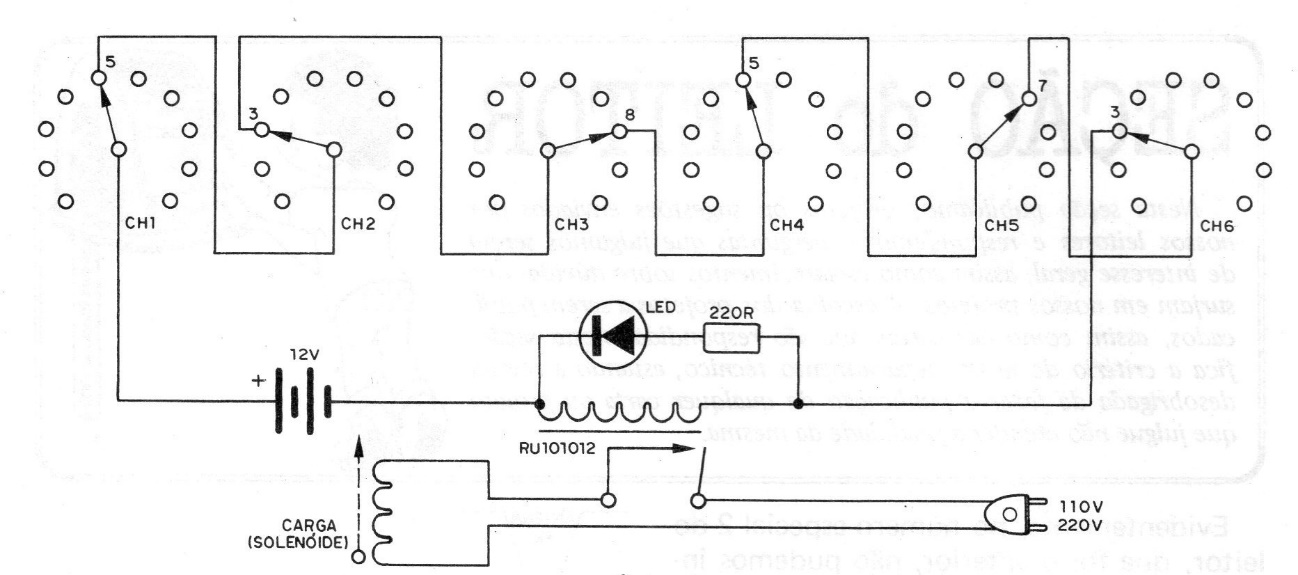 Only the right combination of the positions of the 6 rotary switches of 1 pole x 10 positions of the panel of this device, will activate the relay. This relay is then responsible for supplying a solenoid or electric lock to open a door or safe. The project was found in a 1982 documentation. With 6 keys of 1 pole x 10 positions, nothing more, nothing less than 999 999 combinations are obtained, which means an almost total impossibility of getting the correct answer. combination that opens the system. The figure shows the complete circuit of this device. As we can see, the 6 keys are connected in series, which means that the chain can only circulate if all the keys are connected in the positions chosen for the opening combination. Any switch that has a different position, already prevents the current from circulating and the system does not open. The system is powered by a 6 or 12 V battery, formed by ordinary batteries and according to this battery is the relay used. The contacts of these relays allow the solenoid or lock system to have driving currents of up to 6 A in the 110 or 220 V network. In parallel with the coil of the relay we have a trigger indicator LED. The resistor in series with this LED will be 470 R, if the battery voltage is 6 V and 1 k, if the voltage is 12 V. Important in this circuit is that being in the non-triggered position, there is no battery power consumption, so there is no need to use a main switch. In the example given, the combination that makes the opening is 538573. Another combination can be chosen by the reader. Of course, if the reader wants fewer combinations, he can use fewer keys and fewer poles. The chances of finding the combination that makes the opening will be greater, but even so, very small to be easily hit in the first attempts. The important thing is that the reader, after assembling and closing the safe, do not forget the opening combination, because if that happens ...