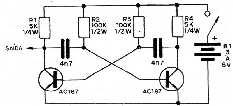 This project was found in a 1982 publication, using only two transistors. Signal injectors are instruments of great use in any repair shop or assembly of radios and amplifiers. The circuit given here takes two NPN transistors for general use and can be powered by 2 or 4 small batteries, that is, with 3 or 6 V. It is an astable multivibrator whose frequency is determined by the values of R2 and R3, as well as for the 4n7 capacitors. These capacitors can be changed to have lower or higher frequencies. The transistors used in the original design of the reader are AC 187, but more modern equivalents such as BC237, BC238 or BC547 can be used instead.